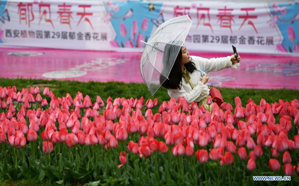 A tourist takes a selfie at Xi'an Botanical Garden in Xi'an, northwest China's Shaanxi Province, April 1, 2021. The 29th spring flower show kicked off recently at Xi'an Botanical Garden. There are more than 30 kinds of tulips planted in the flower show with a total of 200,000 tulips planted in 3,000 square meters. (Xinhua/Li Yibo)