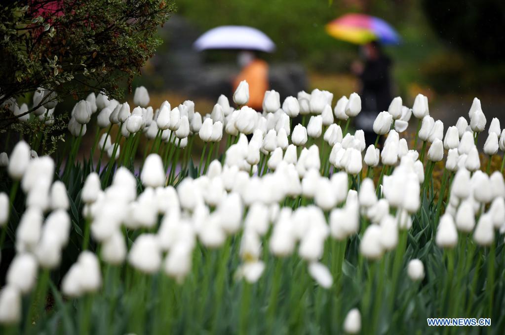 Tourists enjoy flowers at Xi'an Botanical Garden in Xi'an, northwest China's Shaanxi Province, April 1, 2021. The 29th spring flower show kicked off recently at Xi'an Botanical Garden. There are more than 30 kinds of tulips planted in the flower show with a total of 200,000 tulips planted in 3,000 square meters. (Xinhua/Li Yibo)