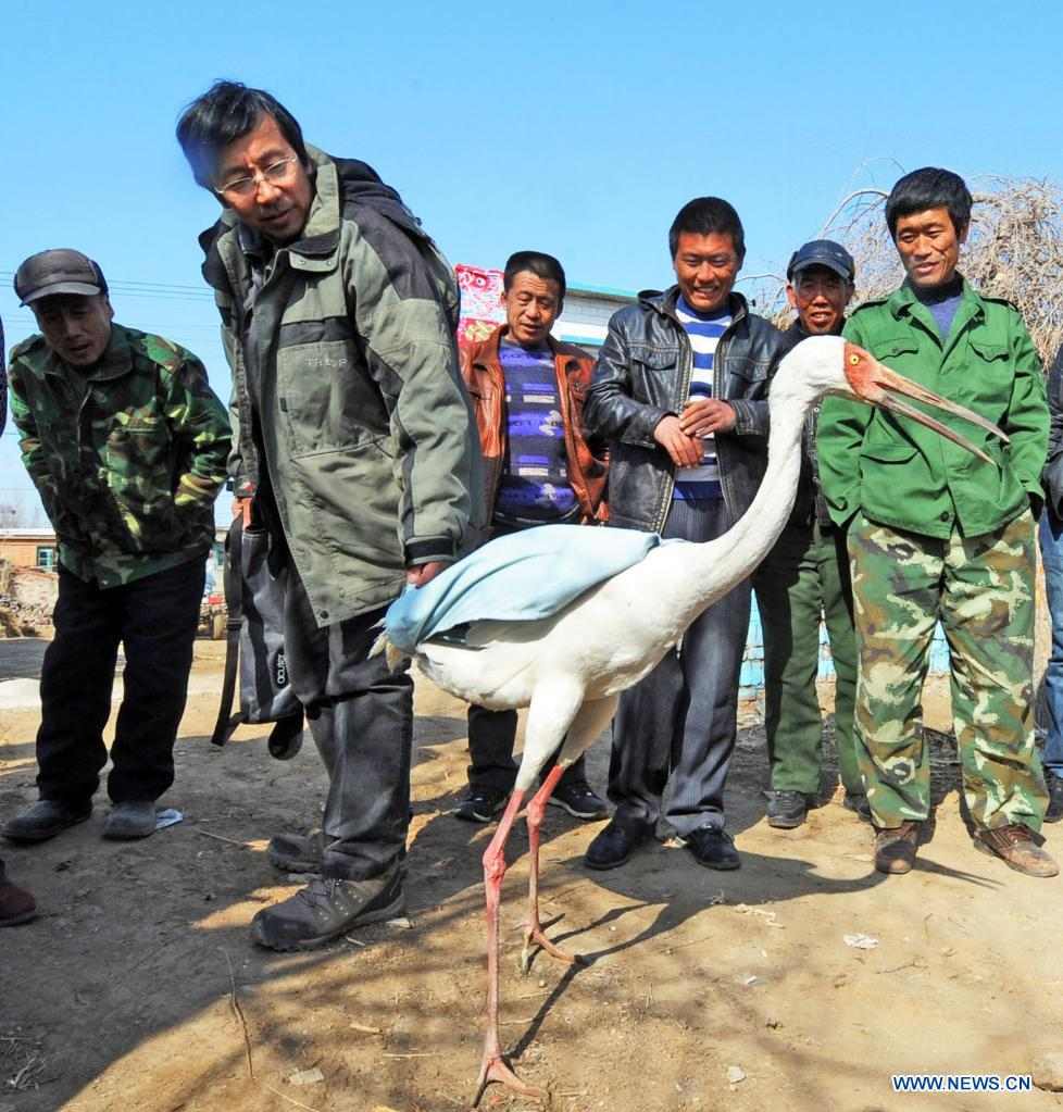 File photo taken on April 1, 2012 shows Wang Weiyan (2nd L) preparing to release a white crane at a wetland in Shenyang, northeast China's Liaoning Province. The Shenyang Raptor Rescue Center is home to injured raptors of all kinds. Wang Weiyan, 58, is the director of the center. Out of deep love for birds, Wang became a volunteer in bird protection. He works as a raptor rehabilitator and has devoted the most precious years of his life to bird care. Established in July 2009 by a group of bird lovers and bird protectors, the Shenyang Raptor Rescue Center has three rescue bases, a cooperative pet hospital, an online WeChat group, and more than 180 volunteers. The volunteers have various occupations such as zoologists, doctors, journalists, teachers, students, workers, farmers and many other professions. The center works on the treatment of injured raptors and birds that are unable to survive independently in the wild. It has so far rescued more than 3,000 wild birds, with the survival rate reaching 70 percent. More than 90 percent of the survivors have been successfully released into nature. Wang Weiyan, who has been engaged in the rescue of raptors for 25 years, is now a bird saving master. He can cure a variety of bird diseases, and he is also willing to pass on his experience to more young people. Now, more young volunteers have joined in the bird protection work. They publicize the knowledge of bird protection in an easy way on the popular Chinese short-video social media platform Douyin. On March 14, more than a dozen once injured goshawks, kestrels, vultures, and eagle owls were released at the Shenyang Raptor Rescue Center. To the bird protection volunteers, it was the happiest moment to see the birds returning to the sky. (Xinhua/Yang Qing)