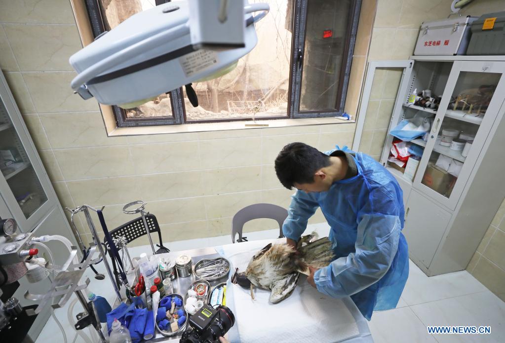 A volunteer checks the condition of an injured raptor at the Shenyang Raptor Rescue Center in Shenyang, northeast China's Liaoning Province, March 14, 2021. The Shenyang Raptor Rescue Center is home to injured raptors of all kinds. Wang Weiyan, 58, is the director of the center. Out of deep love for birds, Wang became a volunteer in bird protection. He works as a raptor rehabilitator and has devoted the most precious years of his life to bird care. Established in July 2009 by a group of bird lovers and bird protectors, the Shenyang Raptor Rescue Center has three rescue bases, a cooperative pet hospital, an online WeChat group, and more than 180 volunteers. The volunteers have various occupations such as zoologists, doctors, journalists, teachers, students, workers, farmers and many other professions. The center works on the treatment of injured raptors and birds that are unable to survive independently in the wild. It has so far rescued more than 3,000 wild birds, with the survival rate reaching 70 percent. More than 90 percent of the survivors have been successfully released into nature. Wang Weiyan, who has been engaged in the rescue of raptors for 25 years, is now a bird saving master. He can cure a variety of bird diseases, and he is also willing to pass on his experience to more young people. Now, more young volunteers have joined in the bird protection work. They publicize the knowledge of bird protection in an easy way on the popular Chinese short-video social media platform Douyin. On March 14, more than a dozen once injured goshawks, kestrels, vultures, and eagle owls were released at the Shenyang Raptor Rescue Center. To the bird protection volunteers, it was the happiest moment to see the birds returning to the sky. (Xinhua/Yang Qing)