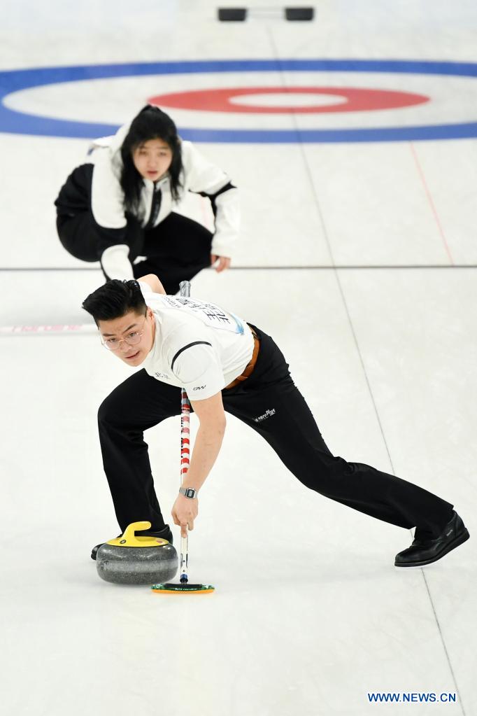 Athletes compete during a curling test program at National Aquatics Center in Beijing, April 1, 2021. A 10-day ice sports test program for the 2022 Olympic and Paralympic Winter Games is held between April 1 and 10, 2021. This test program is to give a test to competition organization, venue operation, and services and safeguarding. It will engage all ice sports of Beijing 2022, namely short track speed skating, speed skating, figure skating, ice hockey, curling, para ice hockey and wheelchair curling. (Xinhua/Ju Huanzong)