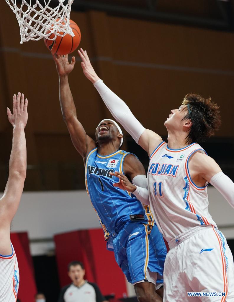 Jonathan Gibson (L) of Beijing Ducks goes to the basket during the 51st round match between Beijing Ducks and Fujian Sturgeons at the 2020-2021 season of the Chinese Basketball Association (CBA) league in Zhuji, east China's Zhejiang Province, April 1, 2021. (Xinhua/Meng Yongmin)