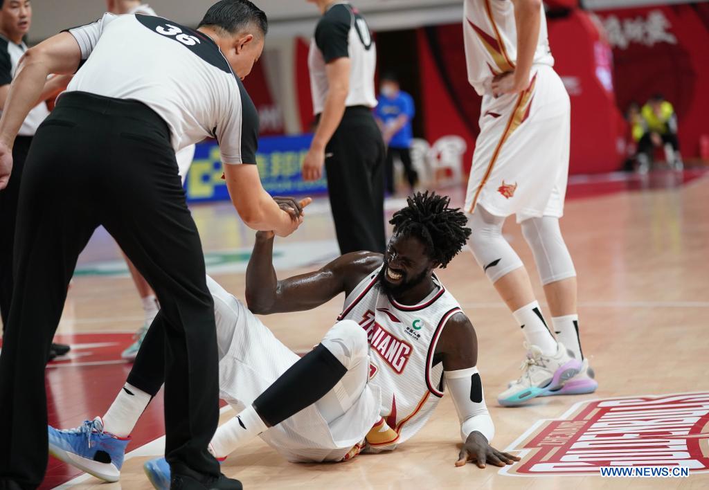 Referee Yan Jun (L) pulls Maurice Ndour of Zhejiang Golden Bulls up during the 51st round match between Shanghai Sharks and Zhejiang Golden Bulls at the 2020-2021 season of the Chinese Basketball Association (CBA) league in Zhuji, east China's Zhejiang Province, April 1, 2021. (Xinhua/Meng Yongmin)