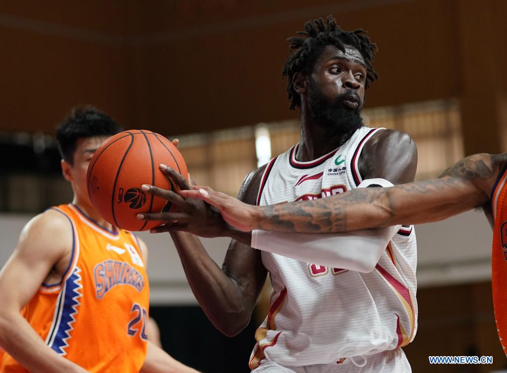 Maurice Ndour (R) of Zhejiang Golden Bulls competes during the 51st round match between Shanghai Sharks and Zhejiang Golden Bulls at the 2020-2021 season of the Chinese Basketball Association (CBA) league in Zhuji, east China's Zhejiang Province, April 1, 2021. (Xinhua/Meng Yongmin)