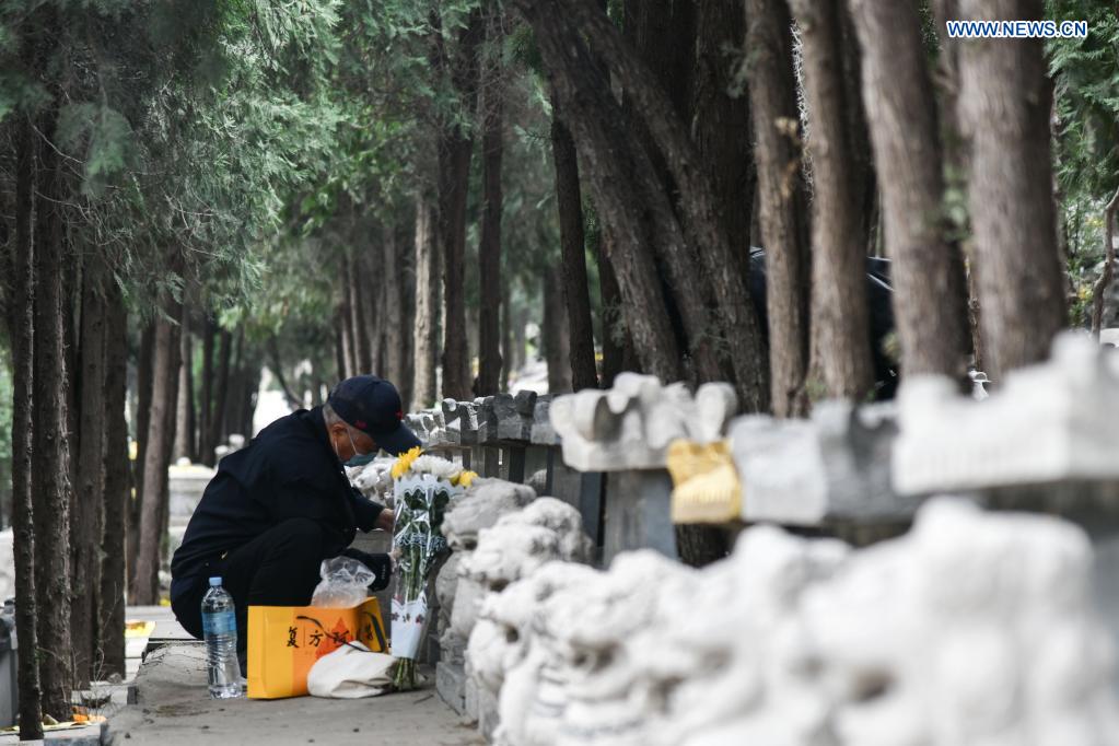 A man visits Yuhanshan Cemetery to pay tribute to the dead ahead of Qingming Festival in Jinan, east China's Shandong Province, April 1, 2021. The Tomb-sweeping Day, also known as Qingming Festival, which falls on April 4 this year, is a Chinese festival when people pay tribute to the dead and worship their ancestors by visiting tombs and making offerings. (Xinhua/Zhu Zheng)