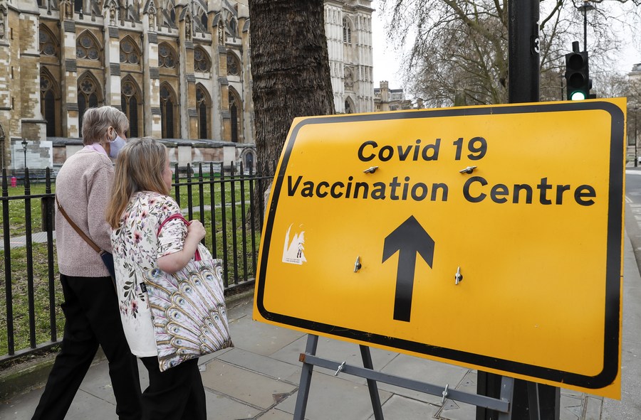 People walk past an NHS (National Health Service) COVID-19 Vaccination Center in London, Britain, on March 31, 2021. (Xinhua/Han Yan)