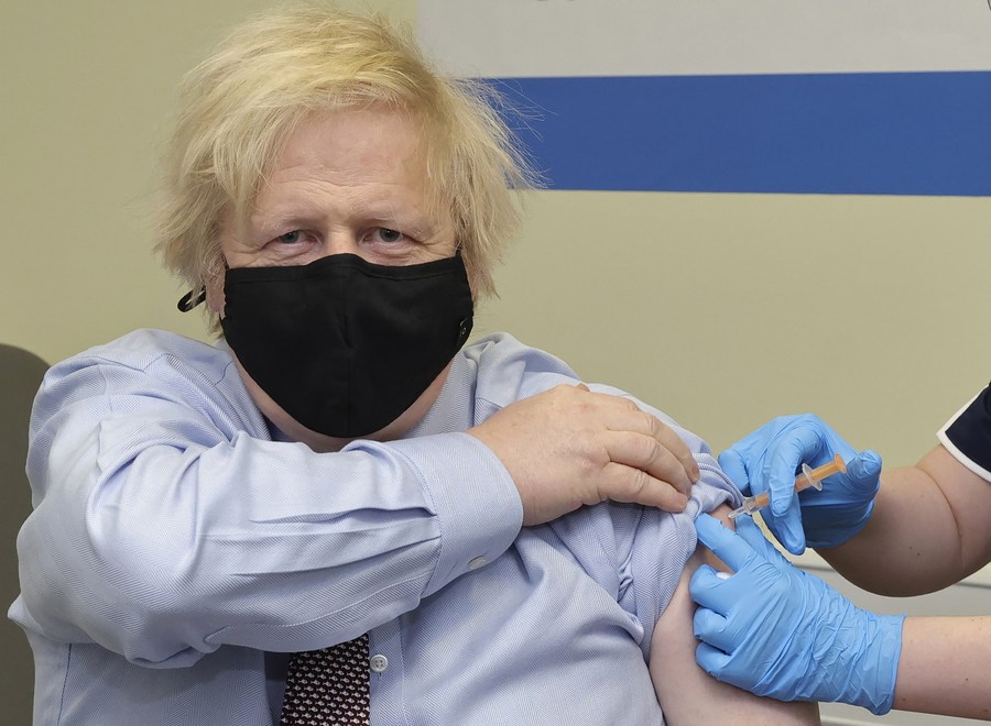 British Prime Minister Boris Johnson is given the Oxford-AstraZeneca COVID-19 vaccine at St Thomas' Hospital in London, Britain, March 19, 2021. (Andrew Parsons/No 10 Downing Street/Handout via Xinhua)