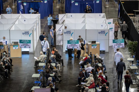 People wait in a COVID-19 vaccination center at the National Velodrome de Saint-Quentin-en-Yvelines in Saint-Quentin-en-Yvelines, France, on March 24, 2021. (Photo by Aurelien Morissard/Xinhua)
