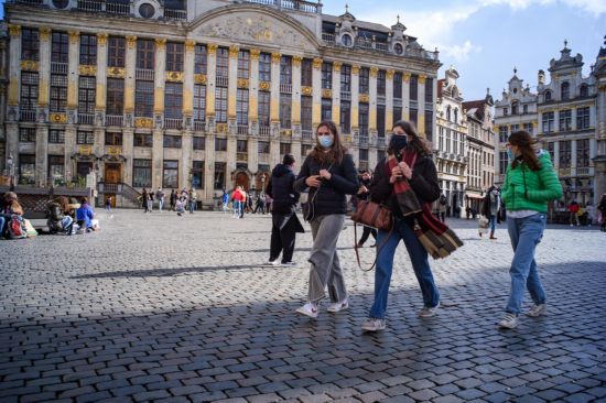 People wearing face masks walk on the Grand Place in Brussels, Belgium, on March 13, 2021. (Xinhua/Zhang Cheng)