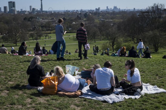 People enjoy the warm weather in London's Primrose Hill, in Britain, March 29, 2021.(Photo by Stephen Chung/Xinhua)