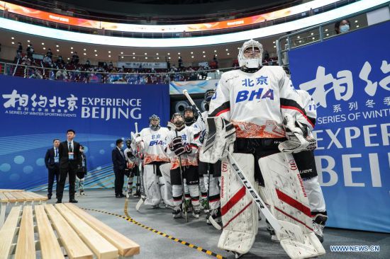 Players enter the rink before an ice hockey test program at the Wukesong Sports Center in Beijing, April 4, 2021. A 10-day ice sports test program for the 2022 Olympic and Paralympic Winter Games is held from April 1 to 10, 2021. This test program is to give a test to competition organization, venue operation, and services and safeguarding. It will engage all ice sports of Beijing 2022, namely short track speed skating, speed skating, figure skating, ice hockey, curling, para ice hockey and wheelchair curling. (Xinhua/Peng Ziyang)