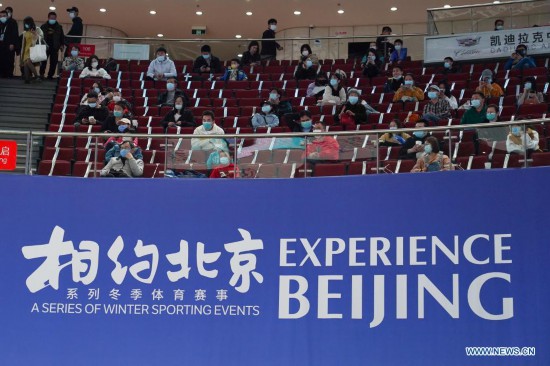 More than one thousand spectators watch the ice hockey test event to stress test the venue operation at the Wukesong Sports Center in Beijing, April 4, 2021. A 10-day ice sports test program for the 2022 Olympic and Paralympic Winter Games is held from April 1 to 10, 2021. This test program is to give a test to competition organization, venue operation, and services and safeguarding. It will engage all ice sports of Beijing 2022, namely short track speed skating, speed skating, figure skating, ice hockey, curling, para ice hockey and wheelchair curling. (Xinhua/Peng Ziyang)