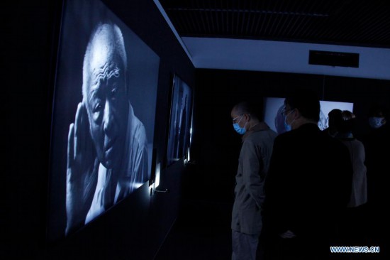 People visit a photo exhibition on Nanjing Massacre survivors at the Memorial Hall of the Victims in Nanjing Massacre by Japanese Invaders, in Nanjing, east China's Jiangsu Province. The exhibition kicked off here on Sunday. (Photo by Sun Zhongnan/Xinhua)