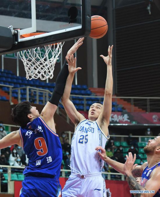 Zheng Qilong (C) of Jiangsu Dragons shoots during the 52nd round match between Xinjiang Flying Tigers and Jiangsu Dragons at the 2020-2021 season of the Chinese Basketball Association (CBA) league in Zhuji, east China's Zhejiang Province, April 4, 2021. (Xinhua/Weng Xinyang)