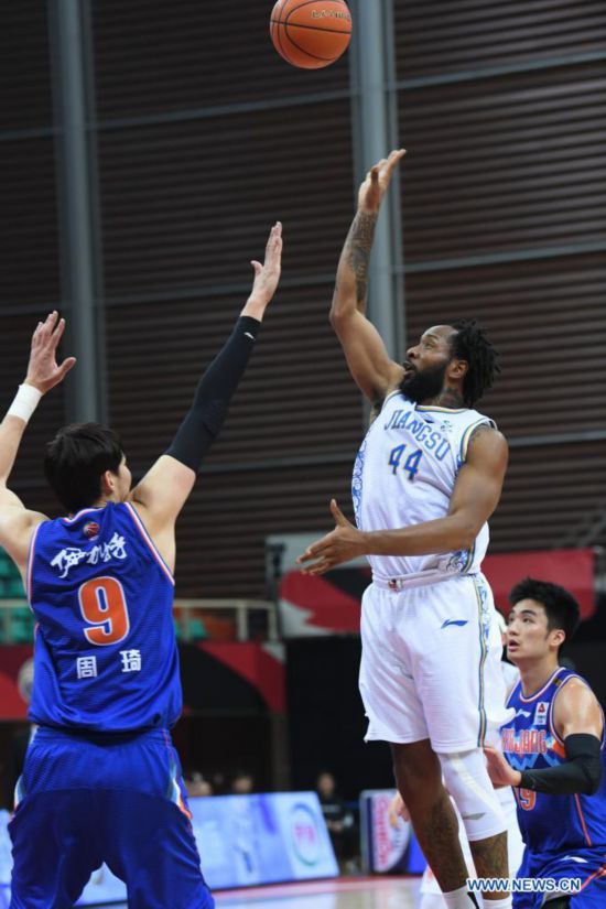 Dezmine Wells (C) of Jiangsu Dragons shoots during the 52nd round match between Xinjiang Flying Tigers and Jiangsu Dragons at the 2020-2021 season of the Chinese Basketball Association (CBA) league in Zhuji, east China's Zhejiang Province, April 4, 2021. (Xinhua/Weng Xinyang)