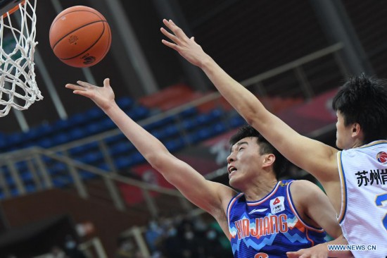 Zeng Lingxu (L) of of Xinjiang Flying Tigers goes to the basket during the 52nd round match between Xinjiang Flying Tigers and Jiangsu Dragons at the 2020-2021 season of the Chinese Basketball Association (CBA) league in Zhuji, east China's Zhejiang Province, April 4, 2021. (Xinhua/Weng Xinyang)