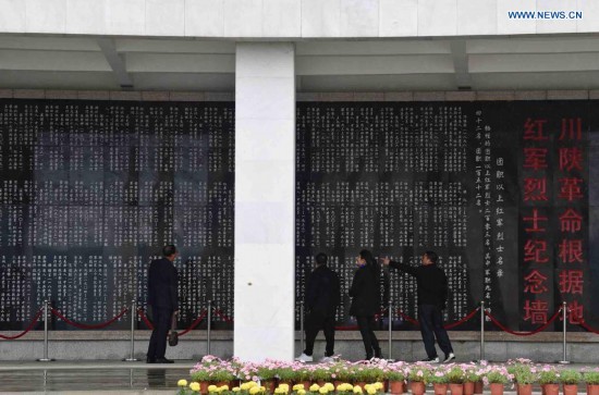 Descendants of Chen Zigang view a memorial wall at the Red Army Martyr Cemetery of Sichuan-Shaanxi Revolutionary Base in Wangping Village of Tongjiang County, southwest China's Sichuan Province, April 3, 2021. On the day, the descendants of Chen Zigang, a Red Army martyr buried in the Red Army Martyrs Cemetery in Sichuan-Shaanxi Revolutionary Base, came to the cemetery thousands of miles away from their hometown Shangcheng County in central China's Henan Province to pay homage to their ancestor. In 2018, they searched online and learned that Chen might be buried in the Red Army Martyrs cemetery. The information was finally confirmed through various efforts. Chen Zigang was born in 1910 in Shangcheng and died in a battle as a Red Army commander in 1933. When he left home, his son Chen Jiasheng was less than one year old. Now, Chen Jiasheng was 93 years old. He could only ask his sons and daughter-in-law to go to the cemetery to pay homage as the Tomb-sweeping Day approached. The Red Army Martyr Cemetery of Sichuan-Shaanxi Revolutionary Base, located in Wangping Village of Tongjiang County of southwest China's Sichuan Province, is the largest Red Army martyr cemetray in China, with 25,048 Red Army martyrs buried here. (Xinhua/Liu Kun)