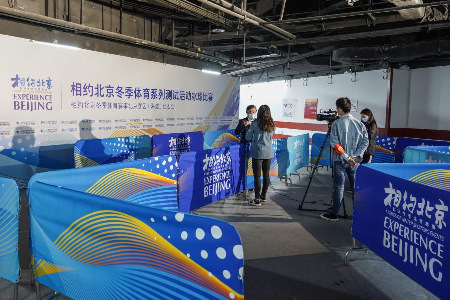Journalists work at the mixed zone during an ice hockey test program at the Wukesong Sports Center in Beijing, April 4, 2021. (Xinhua/Peng Ziyang)