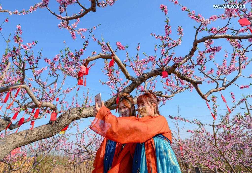 Tourists take selfies at a peach garden demonstration area in Nanbu Township of Handan City, north China's Hebei Province, April 4, 2021. Peach blossoms are in full bloom in Nanbu Township, attracting many tourists. (Xinhua/Wang Xiao)