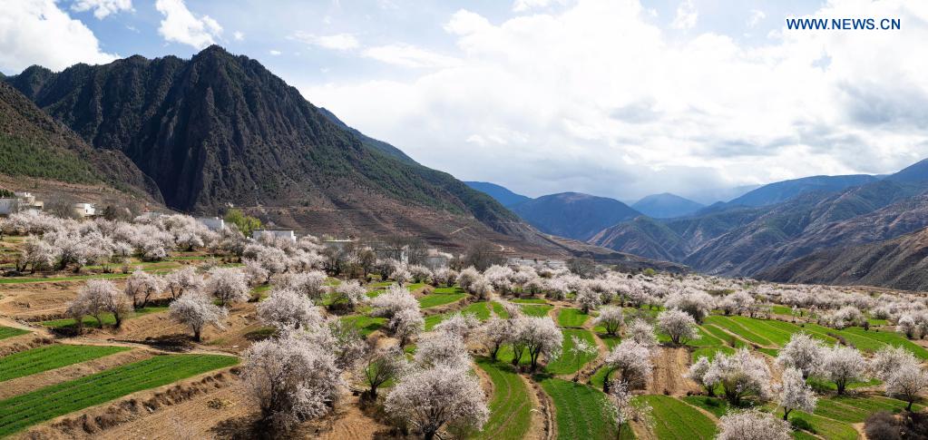 Photo taken on April 3, 2021 shows the scenery of Ridang Village of Baisong Town in Derong County, southwest China's Sichuan Province. Peach blossoms are in full bloom in Derong County. In recent years, the local government has taken advantage of the natural resources to develop rural tourism and helped increase villagers' income. (Xinhua/unreguser)