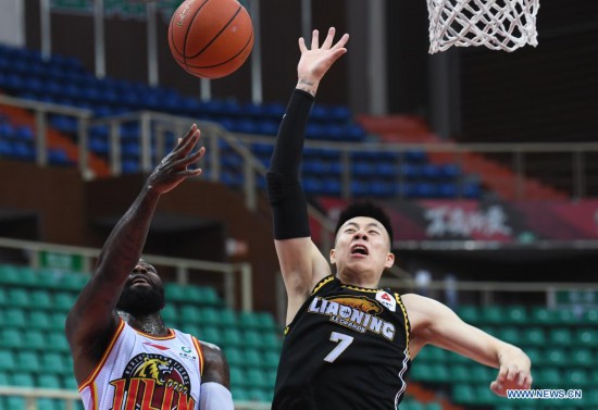Zhang Zhenlin (R) of Liaoning Flying Leopards vies with Dominique Jones of Jilin Northeast Tigers during the 53rd round match between Liaoning Flying Leopards and Jilin Northeast Tigers at the 2020-2021 season of the Chinese Basketball Association (CBA) league in Zhuji, east China's Zhejiang Province, April 6, 2021. (Xinhua/Weng Xinyang)