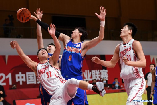 Zhou Qi (2nd R) of Xinjiang Flying Tigers vies with Wang Qingming (1st L) of Qingdao Eagles during the 53rd round match between Qingdao Eagles and Xinjiang Flying Tigers at the 2020-2021 season of the Chinese Basketball Association (CBA) league in Zhuji, east China's Zhejiang Province, April 6, 2021. (Xinhua/Li Ziheng)