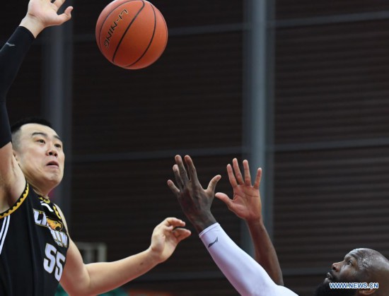 Han Dejun (L) of Liaoning Flying Leopards vies with Dominique Jones of Jilin Northeast Tigers during the 53rd round match between Liaoning Flying Leopards and Jilin Northeast Tigers at the 2020-2021 season of the Chinese Basketball Association (CBA) league in Zhuji, east China's Zhejiang Province, April 6, 2021. (Xinhua/Weng Xinyang)