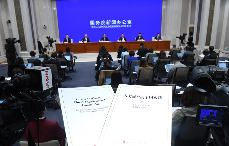 Photo taken on April 6, 2021 shows the Chinese and English editions of the white paper titled "Poverty Alleviation: China's Experience and Contribution" issued by the State Council Information Office at a press conference in Beijing, capital of China. (Xinhua/Jin Liangkuai)
