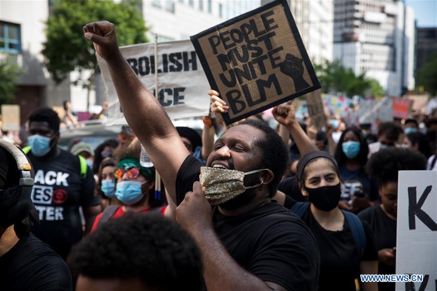 Demonstrators take part in a "Black Lives Matter" protest commemorating Juneteenth in the Brooklyn borough of New York, the United States, June 19, 2020. (Photo by Michael Nagle/Xinhua)