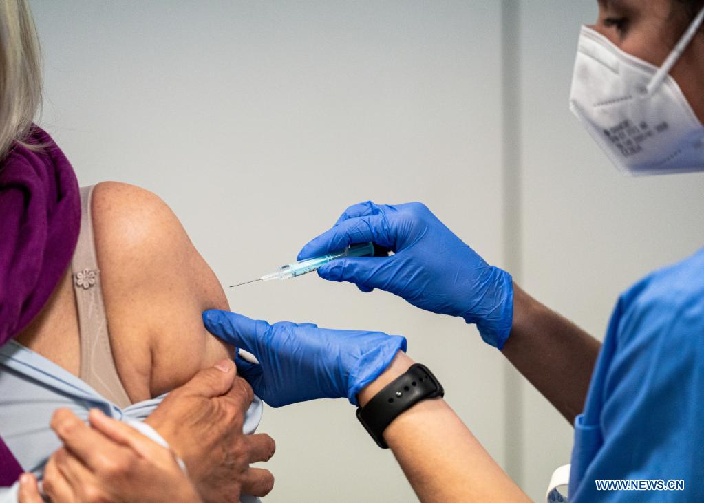 A resident receives a dose of AstraZeneca COVID-19 vaccine at a vaccination site in Cornella, Spain, April 7, 2021. The European Medicines Agency (EMA) confirmed on Wednesday that the occurrence of blood clots with low blood platelets are strongly associated with the administration of AstraZeneca COVID-19 vaccine, but should be still listed as very rare side effects. (Photo by Joan Gosa/Xinhua)