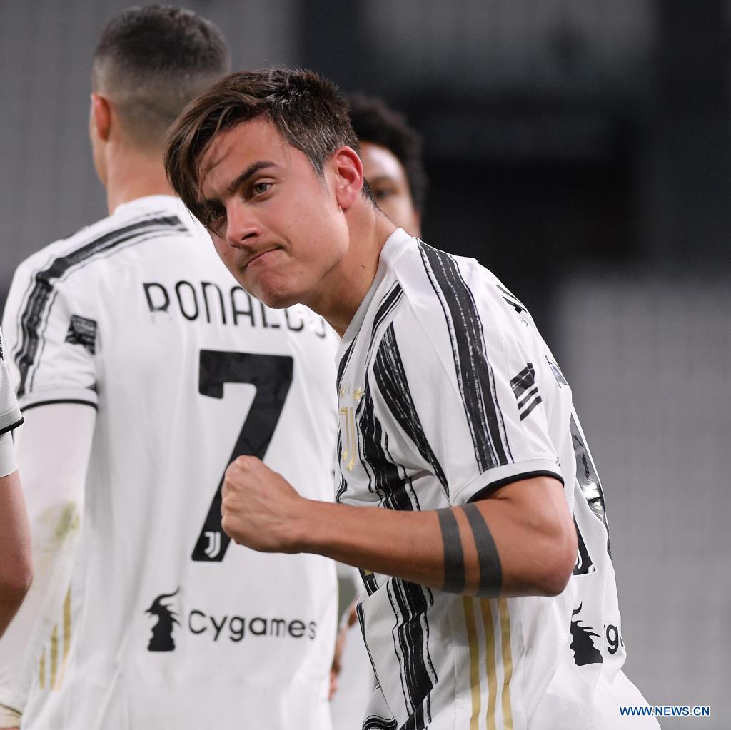 FC Juventus' Paulo Dybala celebrates during a serie A football match between FC Juventus and Napoli in Turin, Italy, April 7, 2021. (Photo by Federico Tardito/Xinhua)