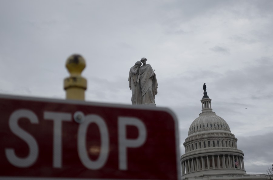 The Capitol and a stop sign are seen in Washington D.C., the United States, on Feb. 13, 2020. (Xinhua/Liu Jie)