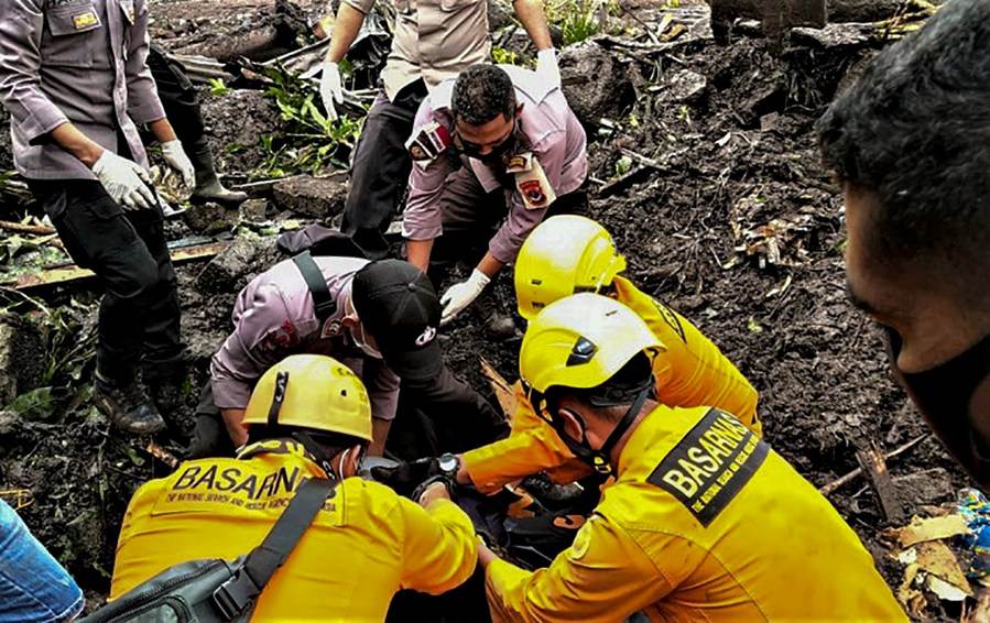 Photo provided by National Search and Rescue Agency (Basarnas) in Maumere on April 6, 2021 shows members of Search and Rescue (SAR) team evacuating a victim of flash floods and landslides in Flores Timur district, East Nusa Tenggara, Indonesia. (Basarnas in Maumere/Handout via Xinhua)