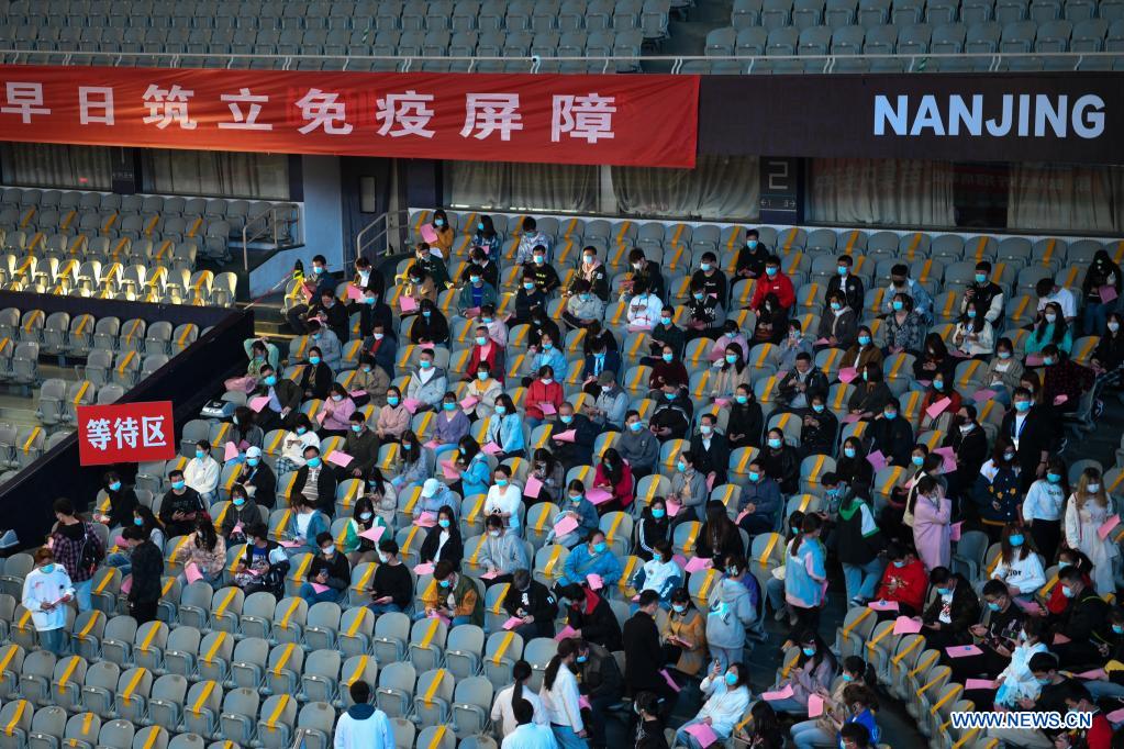 People wait to receive COVID-19 vaccine at a vaccination site in Gulou District of Nanjing, east China's Jiangsu Province, April 9, 2021. East China's Jiangsu Province has launched a mass vaccination campaign against COVID-19. (Xinhua/Li Bo)