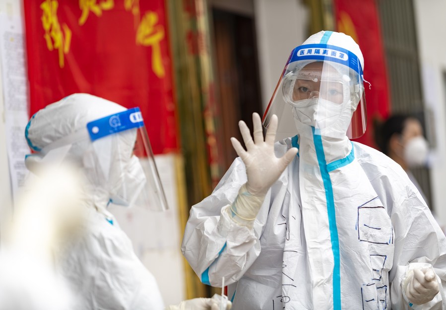 A medical worker communicates with a colleague at a nucleic acid testing site in Ruili City, southwest China's Yunnan Province, April 6, 2021. (Xinhua/Chen Xinbo)
