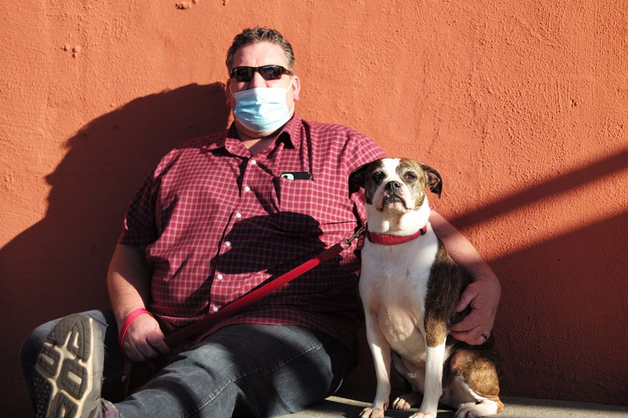 A man enjoys sunshine with his dog at a street corner in Millbrae, San Mateo County, California, the United States, March 6, 2021. (Xinhua/Wu Xiaoling)