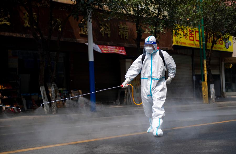 A staff member sprays disinfectant on a street in Ruili City, southwest China's Yunnan Province, April 7, 2021. Frontline medical workers, epidemic prevention and control personnel, border patrol personnel and volunteers from all walks of life work hard to control the spread of the novel coronavirus after new cluster infections were reported late March. (Xinhua/Chen Xinbo)
