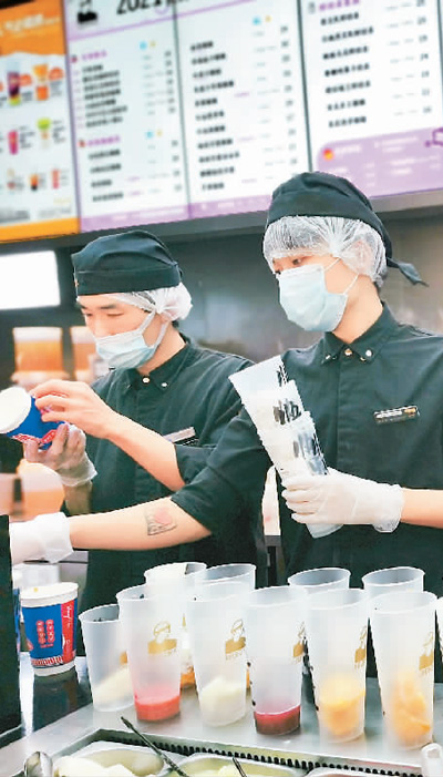 Two beverage concoctors prepare milk tea for customers at a milk tea shop in Chaoyang district, Beijing, April 6. (People's Daily Overseas Edition/Qiao Cai)