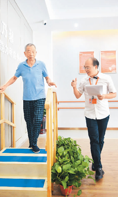 Wang Diquan (R), an ability appraiser for the elderly, learns about a senior citizen's self-care ability at a nursing home in Changsha, central China's Hunan province. (Photo/Xinhua)