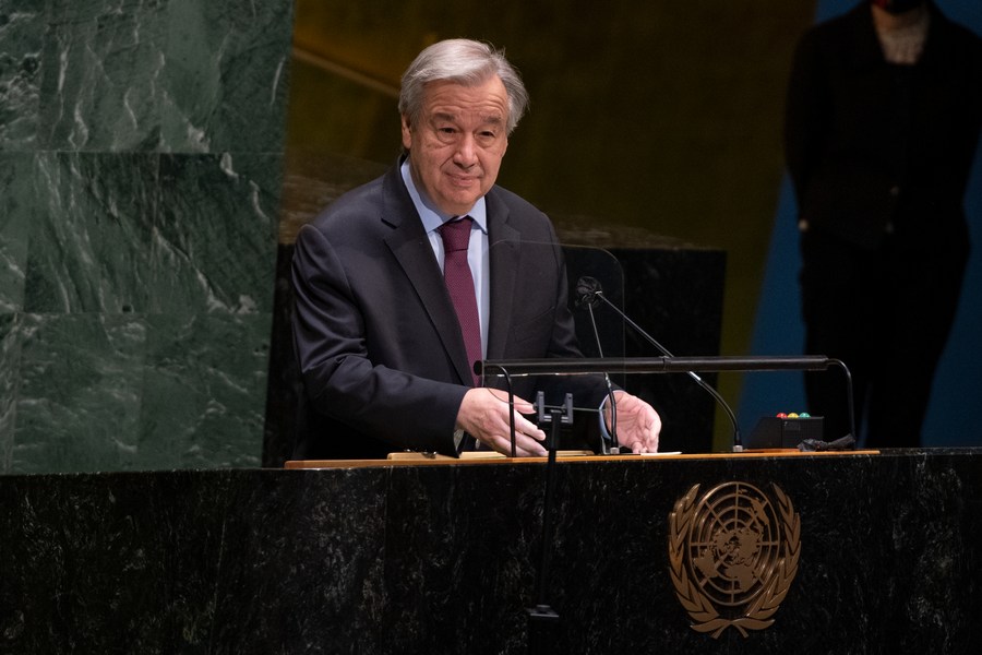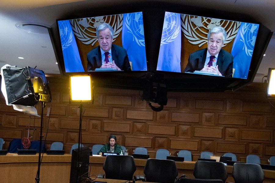 United Nations Secretary-General Antonio Guterres addresses the commemorative meeting of the General Assembly to mark the International Day of Remembrance of the Victims of Slavery and the Transatlantic Slave Trade at the UN headquarters in New York on March 25, 2021. (Eskinder Debebe/UN Photo/Handout via Xinhua)