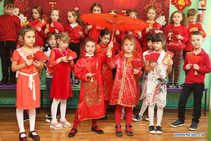 Students in traditional Chinese costumes pose for a photo at Kiev Gymnasium of Oriental Languages No. 1 in Kiev, Ukraine, Feb. 15, 2021. In celebration of the Chinese lunar new year, the school held activities to help students learn about Chinese culture. (Photo by Sergey Starostenko/Xinhua)