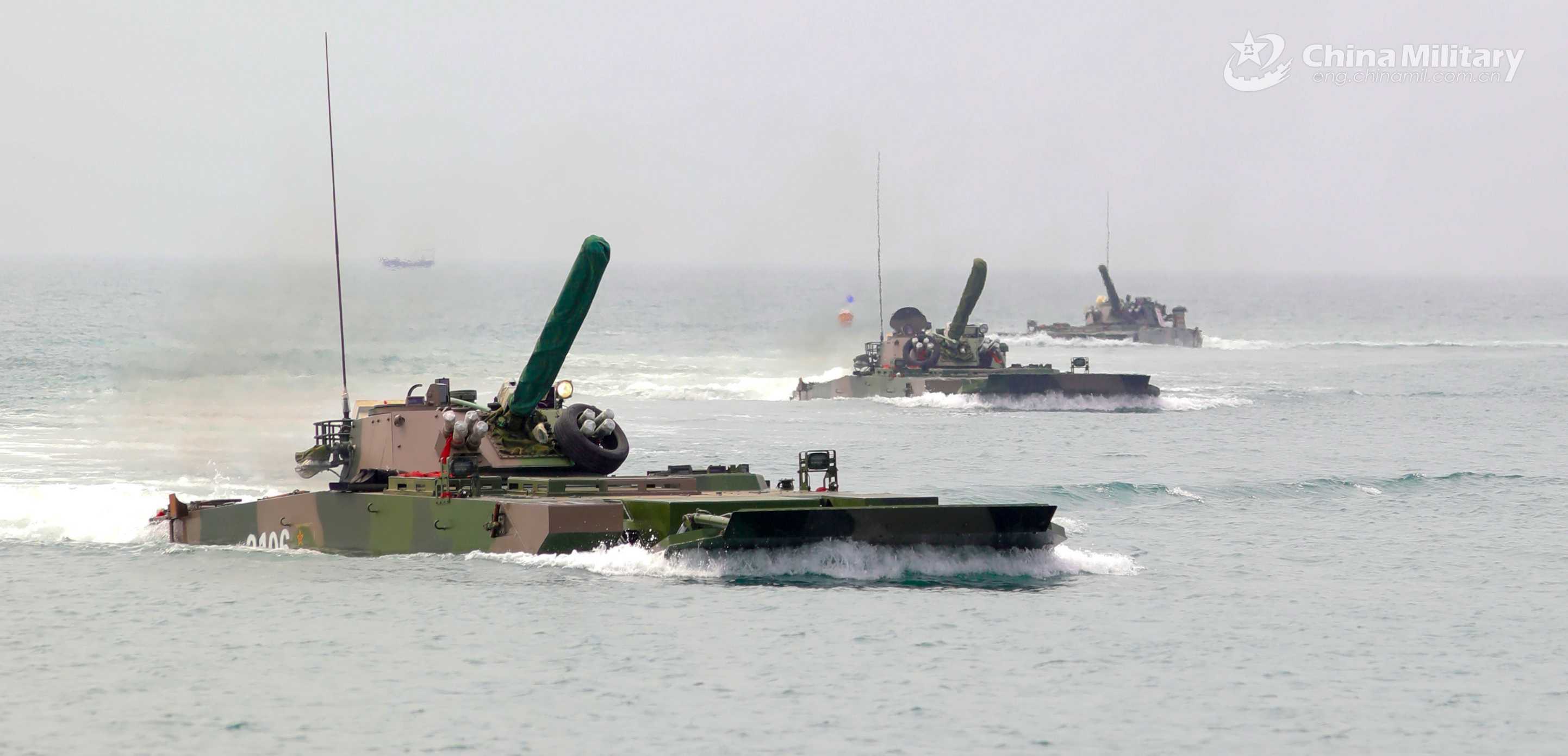 Amphibious armored vehicles attached to a brigade of the PLA 73rd Group Army make their way to the beach-head during a maritime driving drill on March 29, 2021. (eng.chinamil.com.cn/Photo by Wang Lei)