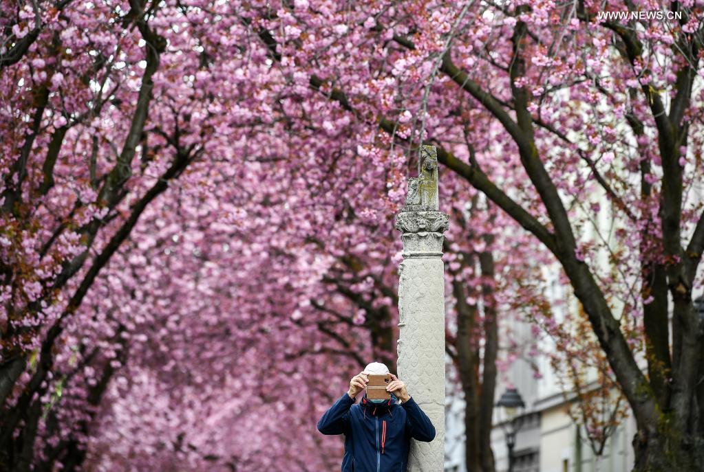 A visitor takes photos of blooming cherry trees in Bonn, Germany, April 13, 2021. (Photo by Ulrich Hufnagel/Xinhua)