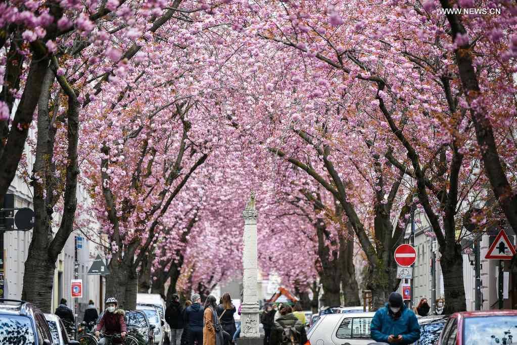 Blooming cherry trees are seen in Bonn, Germany, April 13, 2021. (Photo by Ulrich Hufnagel/Xinhua)