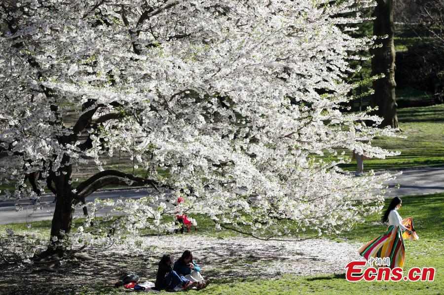 People enjoy the spring scenery in Central Park in New York, the U.S., April 13, 2021. (Photo: China News Service/Liao Pan)