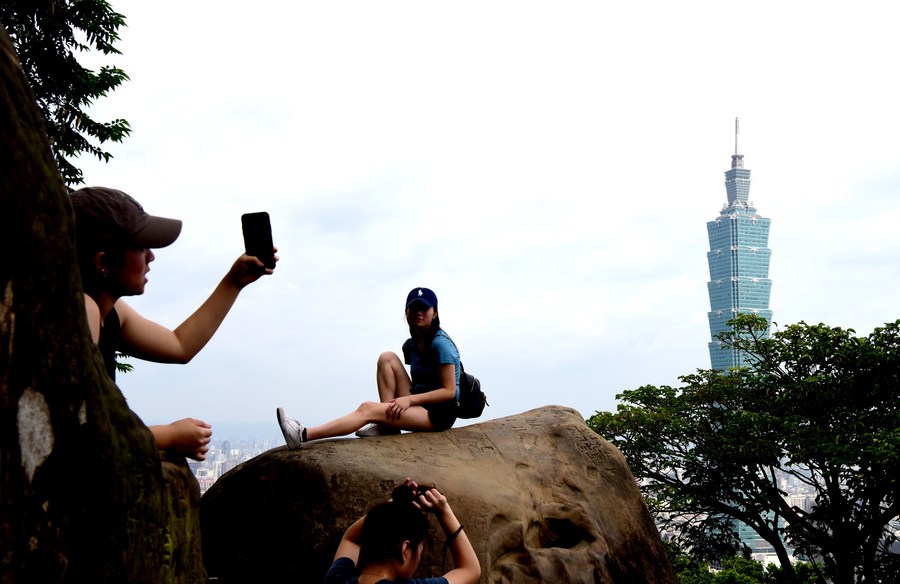 Tourists take photos with the Taipei 101 skyscraper in the background at Xiangshan Mountain in Taipei, southeast China's Taiwan, July 21, 2019. (Xinhua/Zhu Xiang)