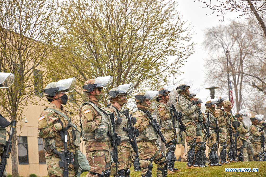Minnesota National Guard stand guard during a protest in Brooklyn Center, Minnesota, the United States, April 13, 2021. Protests continued days after a police officer killed 20-year-old black man Daunte Wright at a traffic stop in Brooklyn Center, in the U.S. state Minnesota. (Photo by Matthew McIntosh/Xinhua)