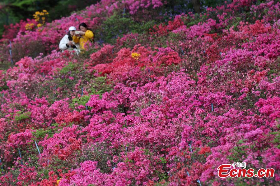 Photo taken on April 14, 2021 shows azaleas blooming at the east section of the Inner Gate of the Great Wall in the Ming Dynasty (1368-1644), Nanjing, east China's Jiangsu Province. (Photo: China News Service/Yang Bo)