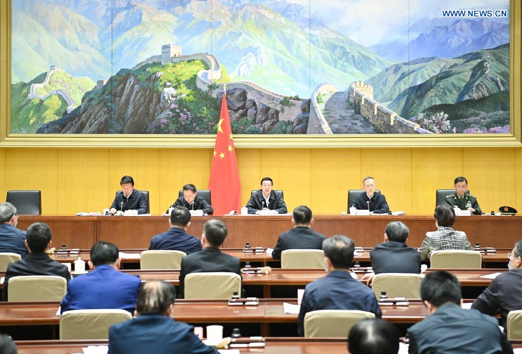 Chinese State Councilor Wang Yong, also head of the State Flood Control and Drought Relief Headquarters, speaks at a video conference on flood control and drought relief in Beijing, capital of China, April 15, 2021. (Xinhua/Li Xiang)