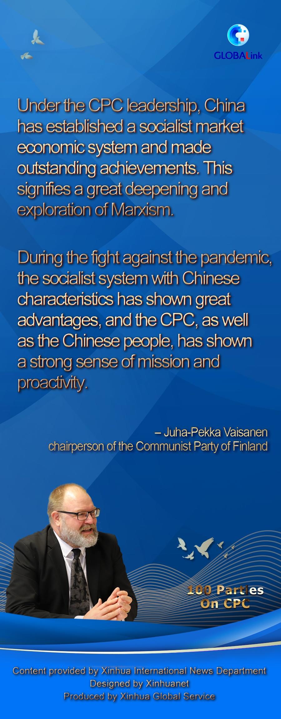 On the ongoing COVID-19 pandemic, Vaisanen said China has, under the leadership of the CPC, contained the virus successfully, and provided help and experience to other countries.